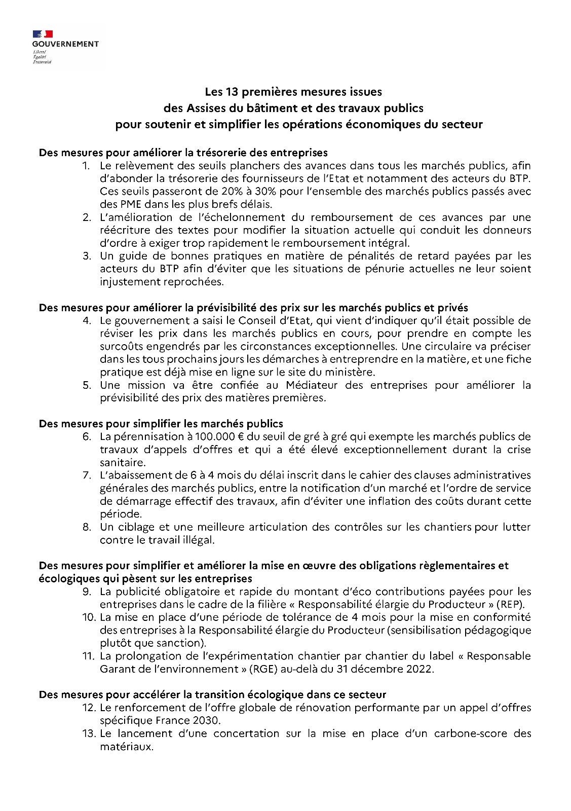 Suite aux assises du BTP, le gouvernement a annoncé les 13 premières mesures pour « permettre au secteur du BTP de faire face à l’augmentation des prix des matériaux, aux difficultés d’approvisionnement des entreprises et accompagner le secteur dans sa transition écologique et numérique et ses besoins de formation ». Ces mesures s’articulent autours de 5 axes prioritaires :