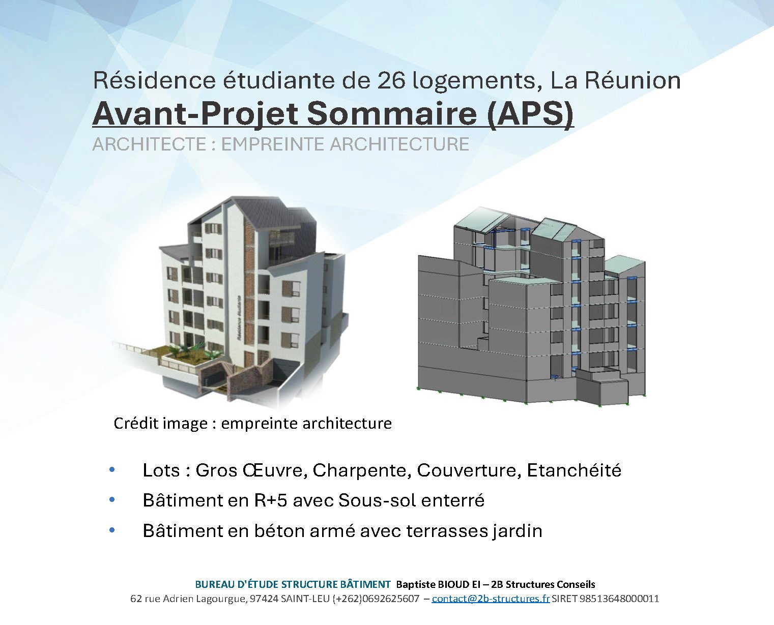 Le bureau d’études a été créé en 2024 à Saint-Leu par Baptiste BIOUD, Ingénieur titulaire du Master Génie Civil de l’Université de La Réunion.